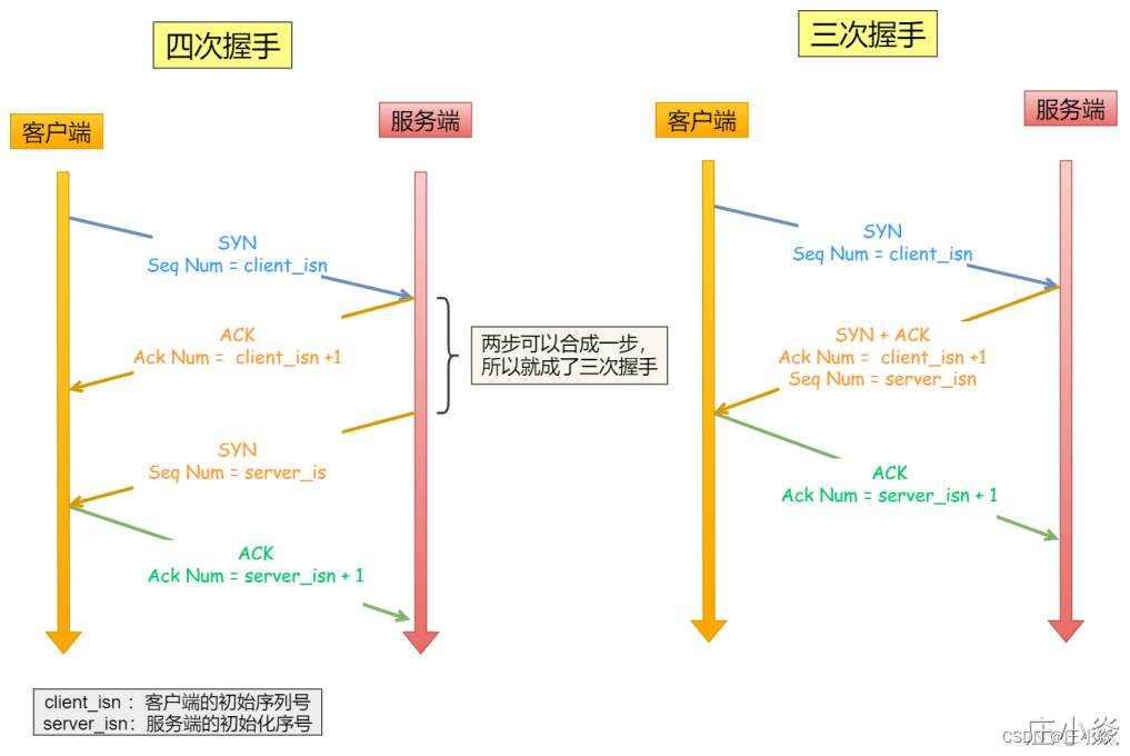 四次握⼿其实也能够可靠的同步双⽅的初始化序号,但由于第⼆步和第三步可以优化成⼀步,所以就成了三次握 ⼿。 ⽽两次握⼿只保证了⼀⽅的初始序列号能被对⽅成功接收,没办法保证双⽅的初始序列号都能被确认接收。