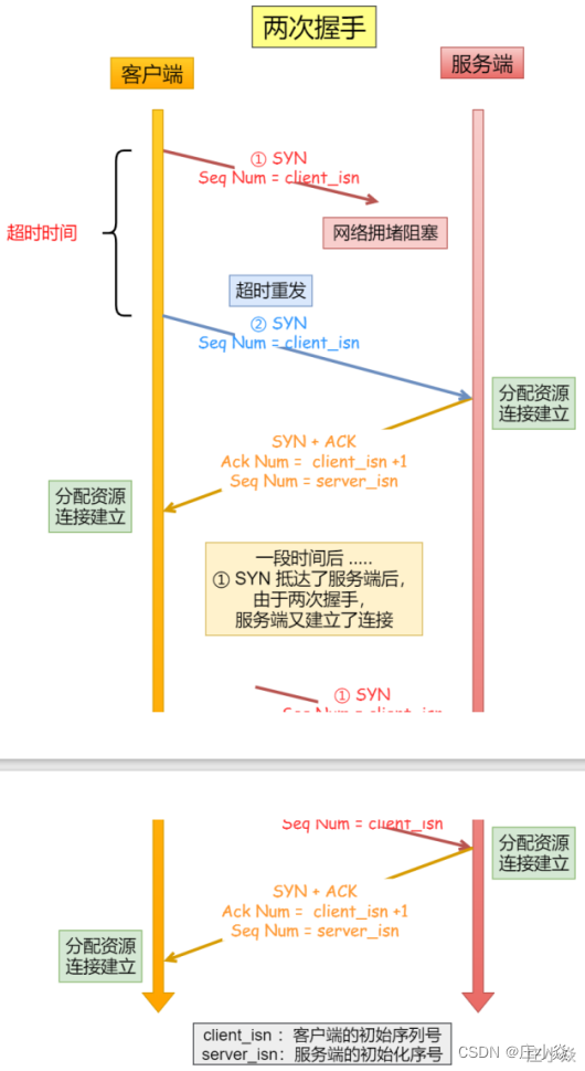 如果只有两次握⼿,当客户端的 SYN 请求连接在⽹络中阻塞,客户端没有接收到 ACK 报⽂,就会重新发送SYN ,由于没有第三次握⼿,服务器不清楚客户端是否收到了⾃⼰发送的建⽴连接的 ACK 确认信号,所以每收到⼀个 SYN就只能先主动建⽴⼀个连接,这会造成什么情况呢? 如果客户端的 SYN 阻塞了,重复发送多次 SYN 报⽂,那么服务器在收到请求后就会建⽴多个冗余的无效的连接,造成不必要的资源浪费。