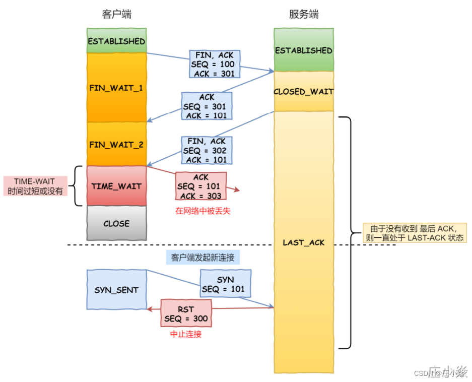 - 如上图红⾊框框客户端四次挥⼿的最后⼀个 ACK 报⽂如果在⽹络中被丢失了,此时如果客户端 TIME- WAIT 过短或没有,则就直接进⼊了 CLOSED 状态了,那么服务端则会⼀直处在 LASE_ACK 状态。