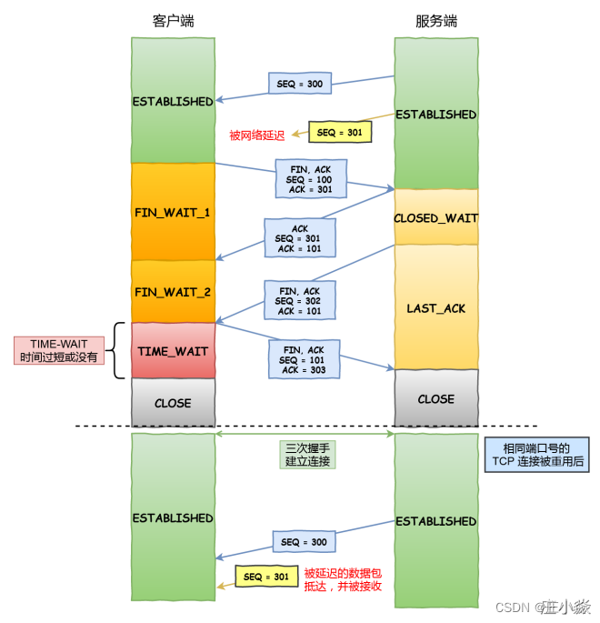 如上图黄色框服务端在关闭连接之前发送的SEQ = 301 报⽂,被网络延迟。 这时有相同端⼝的TCP连接被复⽤后,被延迟的 SEQ = 301 抵达了客户端,那么客户端是有可能正常接收 这个过期的报⽂,这就会产⽣数据错乱等严重的问题。 所以,TCP 就设计出了这么⼀个机制,经过 2MSL 这个时间,⾜以让两个⽅向上的数据包都被丢弃,使得原来 连接的数据包在⽹络中都⾃然消失,再出现的数据包⼀定都是新建⽴连接所产⽣的。