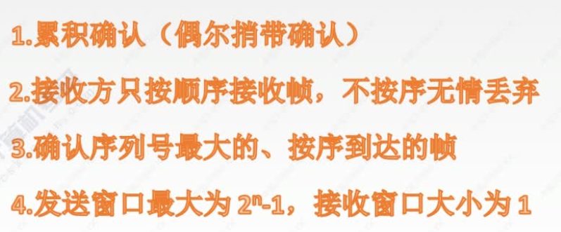 - GBN协议中,对n号帧的确认采用累积确认的方式,标明接收方已经收到n号帧和它之前的全部帧。