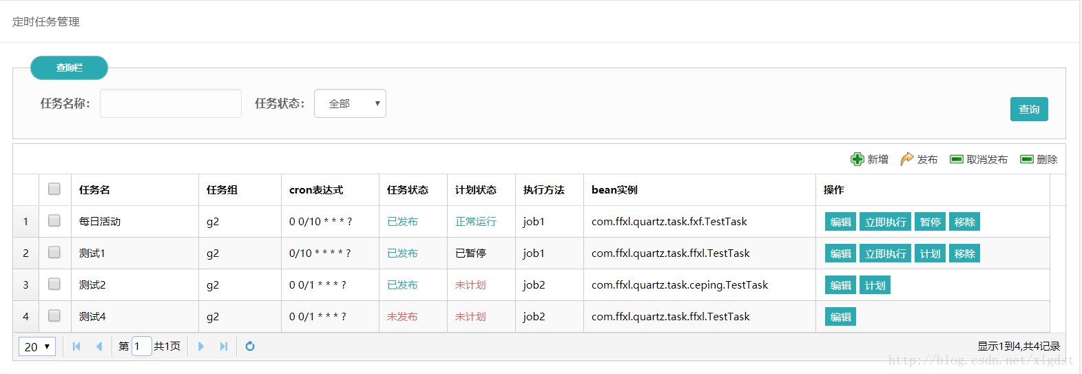 可以看到在这里我把定时任务的状态分为两大类,任务状态跟业务有关,分为已发布和未发布;计划状态跟定时任务的运行有关,分为None,正常运行,已暂停,任务执行中,线程阻塞,未计划,错误