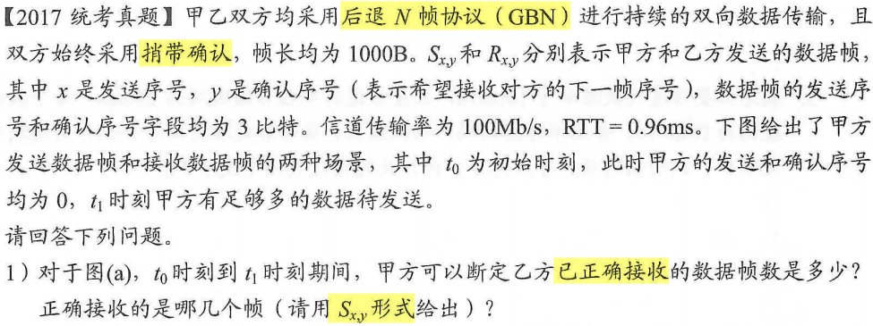 (1)GBN协议中:主机甲在给主机乙发送数据帧并捎带确认时,只能对按序到达的最后一个数据帧(第二问是R1,3)进行确认,即确认号为1+1=2。
