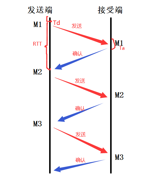 我们假设发送端发送数据所需的时间是Td,数据分组在信道之间往返一次所需的时间为RTT,接受发送确认信息所需的时间是Ta。因为仅仅在时间Td内才是用来传送有用的数据,所以信道利用率就可以这样计算: