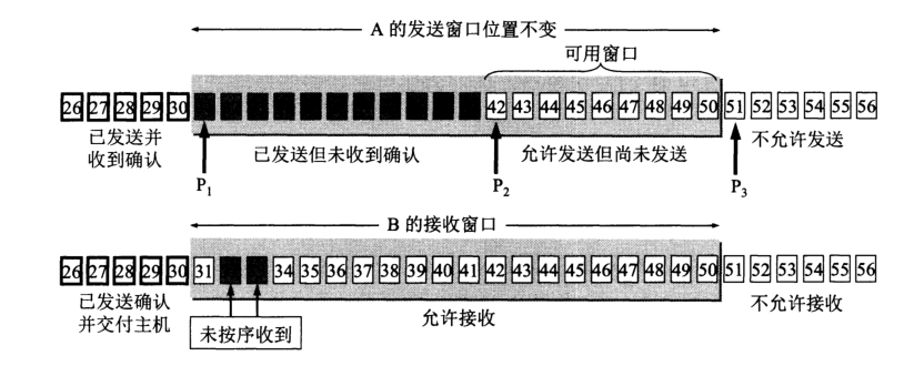 按正常的情况,发送窗口发送多少数据,那么确认信息中期望收到的序号应该是已发送数据的下一个数据序号,但是存在这样一个情况:发送端先发送的数据接受端没有收到,但是后发送的数据接受端正常收到了,那么接受端在发送的确认信息中期望收到的序号值还能是P2所指的方向吗?当然不行,注意接受端的确认信息是按照按序到达的数据中的最高序号给出确认,发送端虽然已经发送了31~41的数据,但是31没有被正常接收,那么确认信息中返回的确认号还是31,而不可能是后边的序号。当31被正常就收之后,我们才返回后边的序号。
