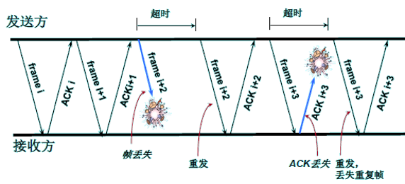 - 发方每发完一个数据帧,就启动一个定时器,若超过定时器所设置的定时时间仍未收到收方的应答帧,则发方重传前面所发送的数据帧。