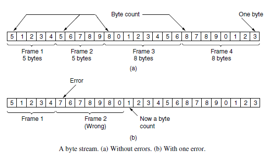 例. 若第2帧的字符计数值应是5,由于传输差错而被“篡改”为7,致使发送方与接收方不同步,而且无法据此确定下一帧的开始位置。此时,若目的主机已知校验和不正确,但仍无法从出错帧中得知下一帧将从哪里开始。即使向源主机发回“请求重传”的信息也没有用,因为目的主机不知道应该回跳多少字符开始重传。