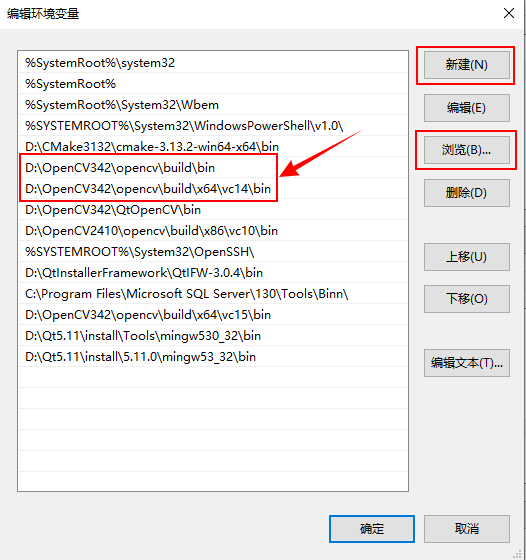 双击“Path”进入到“编辑环境变量”页面,通过新建或者浏览的方式将opencv的“bin文件夹路径”添加到环境变量中,看看自己的电脑是64位还是32位,如果不知道vc14还是vc15可以看下面的VS版本和OpenCV中vc的对应关系表。