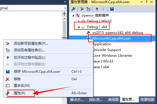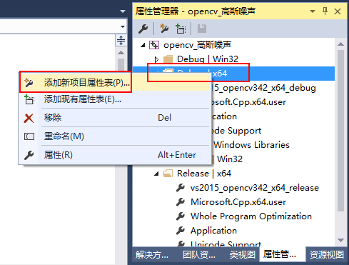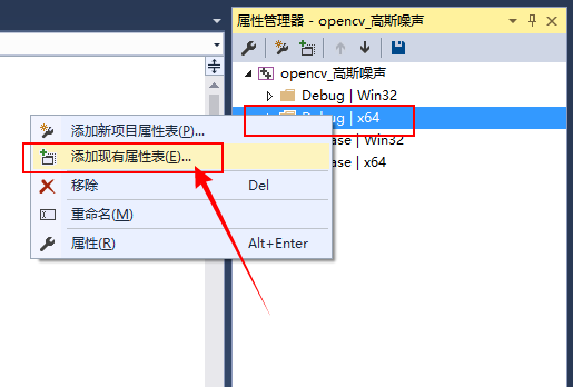 配置完OpenCV属性之后,就可以开始使用OpenCV了。最好是把属性表保存在一个固定的路径中,方便复制、粘贴,使用在下一个项目中。添加属性表也很简单,先把属性表复制、粘贴到当前项目的项目文件夹中,然后打开“属性管理器”,找到对应的“模式”和“位数”,这里是“Debug|x64”,然后点击鼠标右键选择“添加现有属性表”,把复制、粘贴好的属性表文件添加进来就可以了。