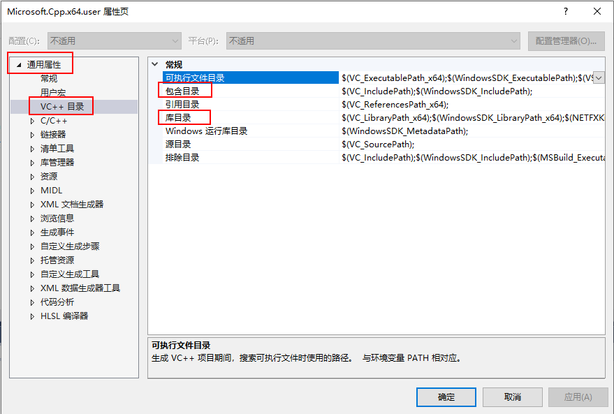 右键选择“属性”,进入“Microsoft.Cpp.x64.user的属性页”,依次选择“通用属性”、“VC++目录”,开始添加“包含目录”、“库目录”。