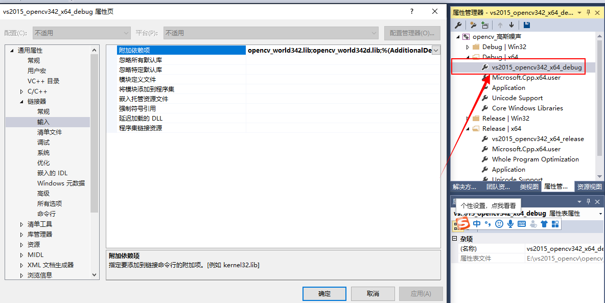此时,双击“vs2015_opencv342_x64_debug” ,进入到“vs2015_opencv342_x64_debug属性页”,然后就跟前面配置过OpenCV属性的操作一模一样了,自己去看前面的教程,就不重复了。