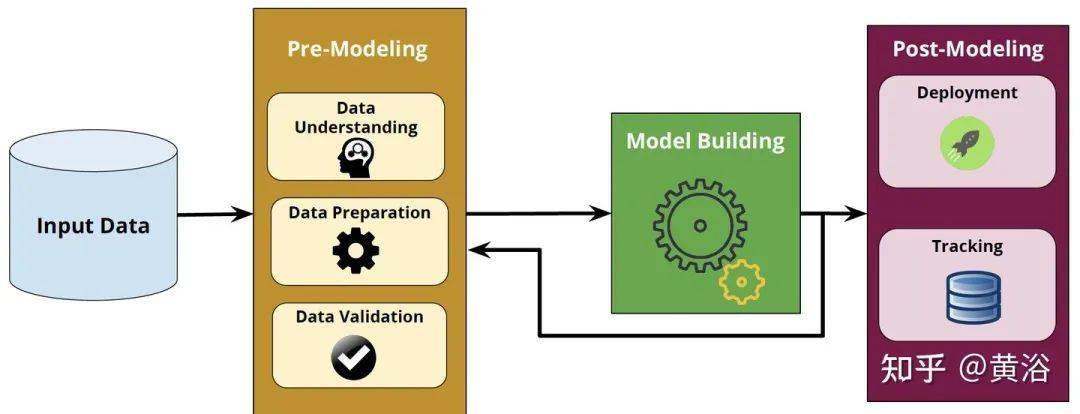 一个机器学习建模的工程还有几个方面需要人工干预和可解释性,即机器学习落地流水线的两个主要组件:预-建模和后-建模(如图)。