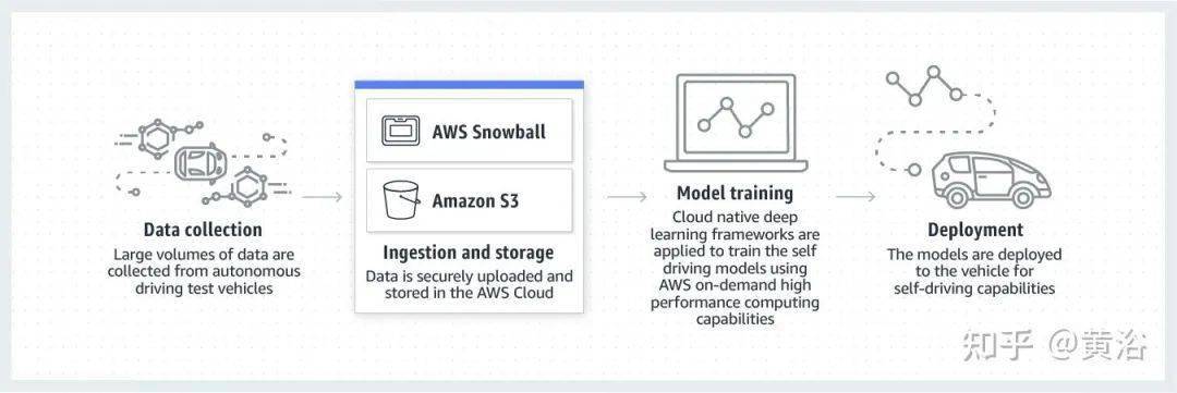 下图是AWS给出的一个自动驾驶数据流水线框架:数据收集、注入和存储、模型训练和部署;其中Snowball是AWS的边缘计算系列之一,负责车辆和AWS S3之间的数据传输;其他还有两个,是AWS Snowcone和 AWS Snowmobile。
