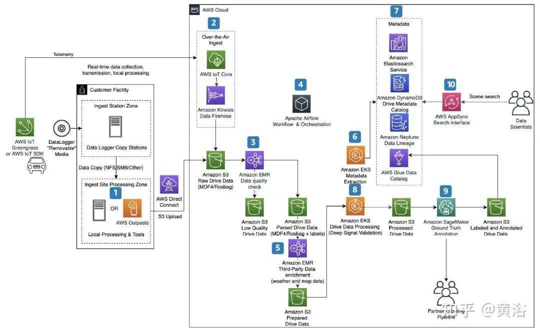 下图是亚马逊云AWS提供的自动驾驶数据处理服务平台例子:其中标明1-10个任务环节