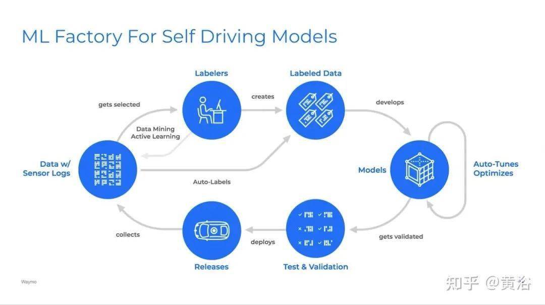 这是谷歌waymo报告提到的数据闭环平台:其中有数据挖掘、主动学习、自动标注、自动化模型调试优化、测试校验和部署发布。