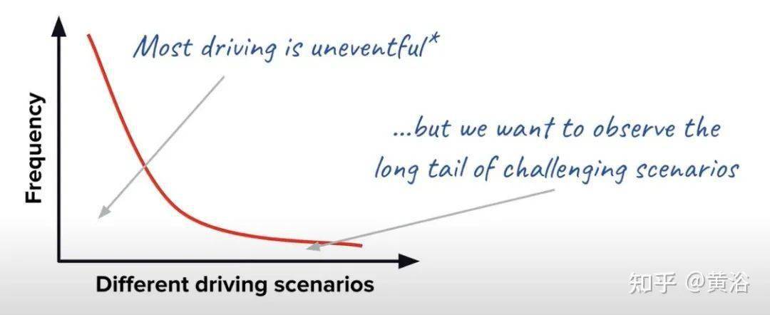最近自动驾驶和数据闭环结合在一起,原因是自动驾驶工程已经被认可是一个解决数据分布“长尾问题”的任务,时而出现的corner case(极端情况)是对数据驱动的算法模型进行升级的来源之一,如图所示。