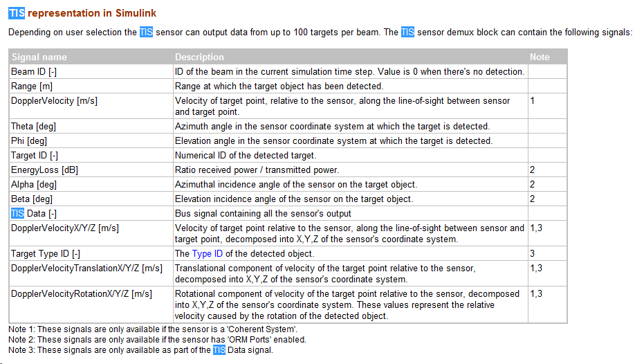 该类型中包含了实际应用中使用的三雷达(Lidar激光雷达/Radar雷达,一般指毫米波雷达/Ultrasonic超声波雷达)一相机。为了提供超广角的视角,PreScan还提供了鱼眼相机。以上都比较容易理解和使用。值得注意的是PreScan还提供了TIS,TIS是是一种通用的主动扫描传感器,在help中解释为active scanning sensor,TIS可以帮助使用者使用和理解active scanning sensor。它并不是依赖于某一种雷达的技术,而是一种根据这些雷达的通用原则设计的扫描型传感,三种雷达无论是哪一种,本质上都是对周围环境进行扫描,区别在于扫描的方法不同,即在于是使用激光、毫米波还是超声波。因此TIS的全称是Technology Independent Sensor。使用时需要注意TIS的输出很多,最多可以在一束光柱中输出100个目标的数据,根据需要可以输出不同的signal。如下: