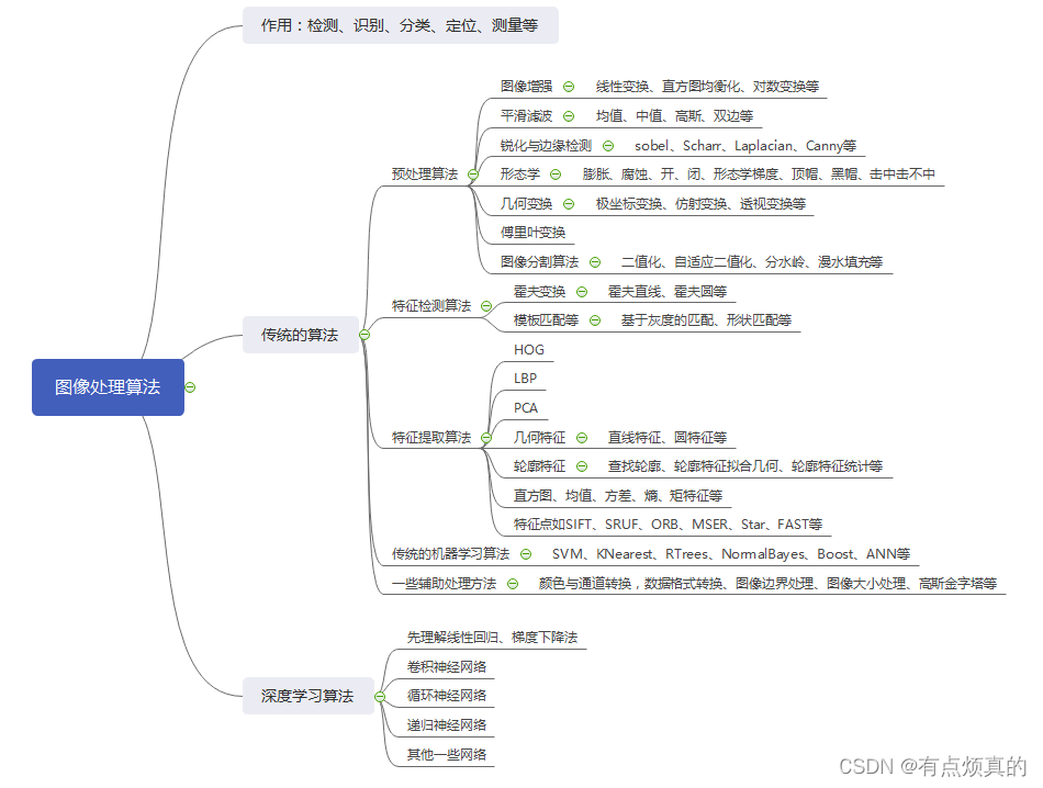 为了实现计算机视觉检测、识别、分类、定位以及测量等任务,就需要相应的视觉图像处理算法。我们可以把这些算法大致进行了分类,分类可能不太准确,但是不影响学习,也可以作为参考,见图1。其中,深度学习算法其实是机器学习算法的一种,这里单独列出来了。