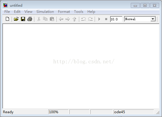 在仿真库浏览器窗口中选择菜单 File-New-Model;弹出一个仿真工作窗口;看下,默认仿真停止时间是10.0;