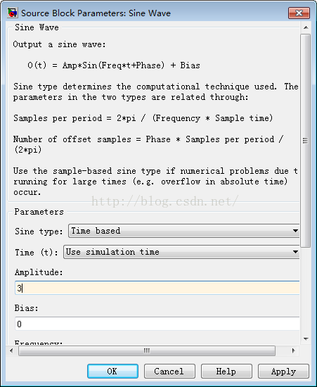 双击正弦波组件,弹出该组件的参数设置窗口,修改正弦波幅度为3;