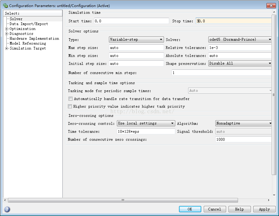 在仿真窗口菜单中选择 仿真-配置参数,弹出参数配置窗;修改仿真停止时间为30.0;