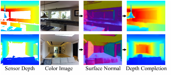 图1所示。 深度完成。 利用颜色预测法线,对RGB-D图像的深度通道进行大面积缺失区域的填充,然后求解完整的深度。
