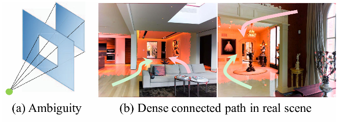 不幸的是,仅从表面法线和遮挡边界求解深度在理论上是不可能的。 有些病理情况下,图像不同部分之间的深度关系不能仅从法线推断出来。 例如,在图4(a)中,仅根据给定的表面法线是不可能推断出通过窗口看到的墙的深度的。 在这种情况下,可见区域的墙壁是完全封闭的