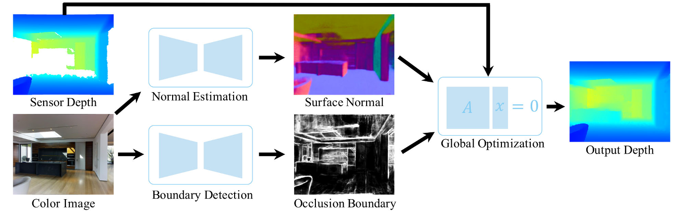 图2。 系统管道。 在给定一幅输入RGB-D图像的情况下,利用颜色预测表面法线和遮挡边界,然后利用输入深度正则化的全局线性优化算法求解输出深度。