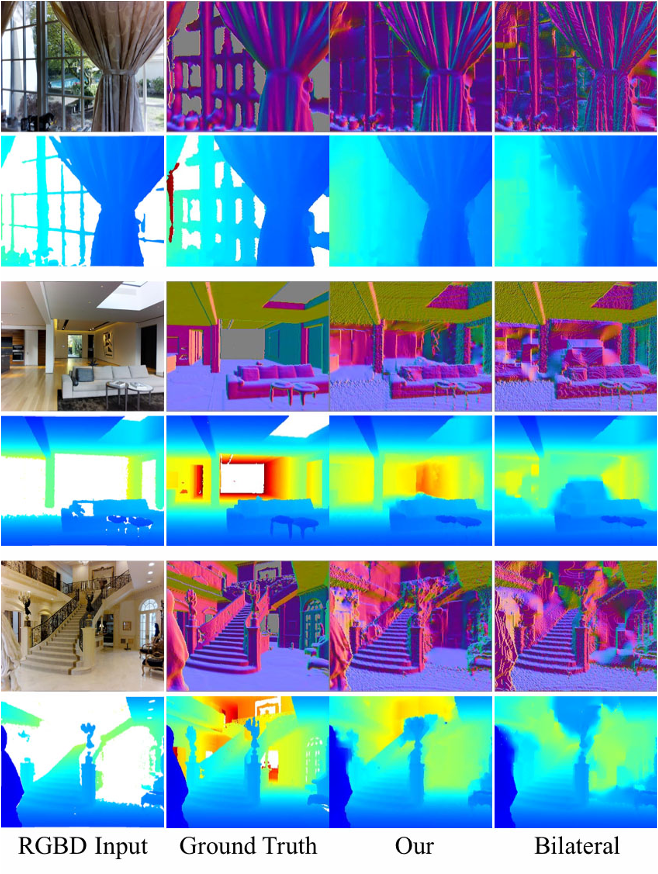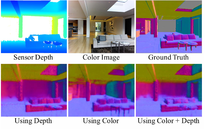我们推测,原始深度训练的网络主要学习直接从深度计算法线,而没有学习如何在深度不存在的情况下从颜色预测法线,这是深度补全的关键技能。 一般来说,我们发现,即使给网络一个额外的通道,其中包含一个二进制掩码,表明哪个像素具有观察到的深度,网络也能更好地从颜色而不是深度来预测normals[79]。 例如,在图5中,我们看到仅从颜色预测的大洞中的法线比从深度预测的法线好,并且与从颜色和深度预测的法线一样好。 表1中的定量实验支持了这一发现。