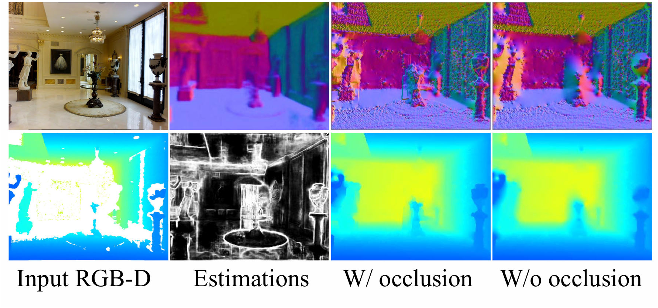 然而,一个关键的问题是,我们如何使用预测的表面法线和遮挡边界来完成深度图像。 一些研究人员已经使用预测法线来细化观察到的3D表面的细节[28,55,74],Galliani等人使用表面法线来恢复桌面对象多视图重建中缺失的几何形状。 然而,对于复杂环境下单目RGB-D图像的深度估计或补全,还没有人使用过表面法线。