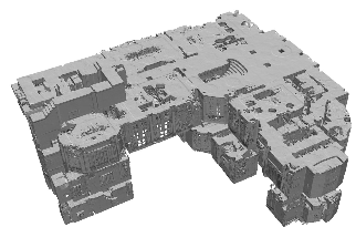 对于Matterport3D数据集中的每个场景,使用以下过程对网格进行重构和渲染,以提供“完整的深度图像”。 首先,每个房子都被手动划分成大致对应于房间的区域,使用交互式的平面图绘制界面。 其次,提取每个区域内包含RGB-D点(像素)的密集点云,不包括距离摄像机4米以上的像素(避免重构网格中的噪声)。 第三,利用经过筛选的泊松曲面重建[33],深度为oc-tree 11,从每个区域的点重建网格。 然后对所有区域的网格进行合并,形成每个场景的最终重构网格M。 然后,使用OpenGL为每个原始的RGB-D相机视图创建“完成深度图像”,并读取深度缓冲区。