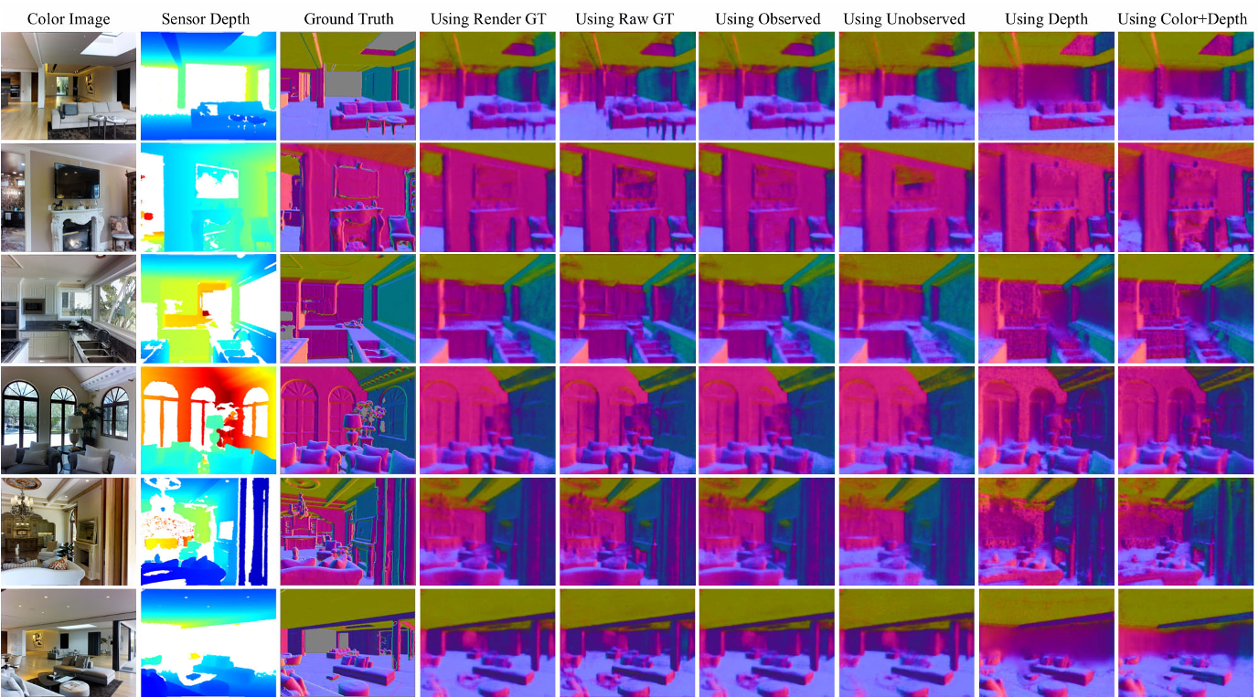 图11。 不同训练设置下的正常估计比较。 第4列显示仅使用颜色作为输入训练模型的输出,以及所有像素的渲染深度作为监督,这是我们为系统选择的设置。 相对而言,它比其他替代训练设置生成更好的表面法线。