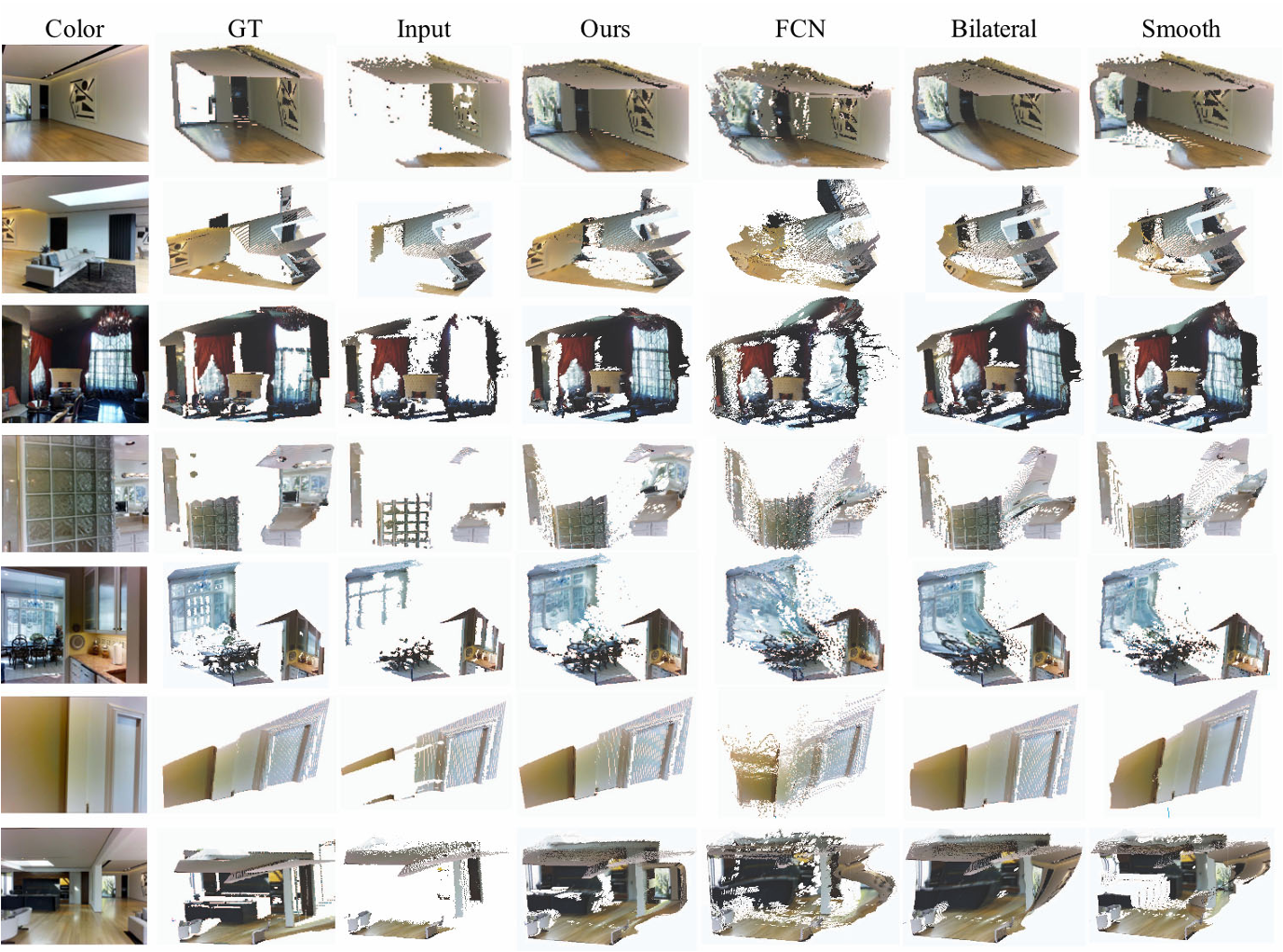 我们还将完成的深度图转换为三维点云进行可视化和比较,如图13所示。 利用Matter-port3D数据集中提供的相机内建特性,将深度图上的每个像素投影到三维点上,并从彩色图像中复制颜色强度。 每一行都显示一个例子,其中彩色图像和点云由地面真实值转换而来,输入深度(即包含大量缺失区域的传感器原始深度),以及我们的方法FCN[50]的结果,联合双侧滤波[64],平滑inpainting。 与其他方法相比,我们的方法保持了更好的三维几何形状和更少的边界出血。