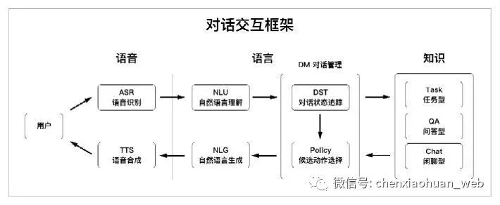 从产品角度看,对话系统执行任务的过程其实可以大致分为三个阶段:理解阶段、思考阶段和执行阶段。理解阶段,即理解人类的需求,常用技术有语音识别、图像识别、自然语言理解等。思考阶段,即寻找需求的解决方案,常用技术有搜索引擎、推荐系统、知识图谱等。执行阶段,即完成人类的需求,常用的技术有自然语言生成、智能家居/物联网和目前被用来满足需求的其他技术。