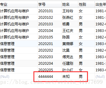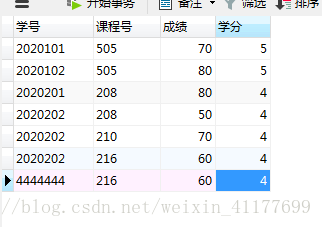 使用以上语句,因为在xscj表中只可能插入学生的学号,而在更新xsqk表时,发现姓名是不能为空的,所以在触发器处设定姓名为“未知”。在xscj表中插入了一条学号为4444444的记录后,在xsqk表中,可以看到增加了一条相应的记录。