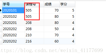 如下图,将学生课程表中Qbasic课程的课程号改为505后,在xscj中的课程号也发生改变,变成了505