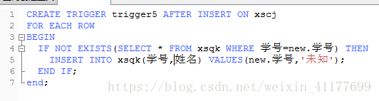 4、创建触发器trigger5,实现当向学生成绩表(xscj)中插入一条选课记录时,查看该学生的信息是否存在在学生信息表中,如果不存在,则把该学生的基本信息加入到学生信息表中。