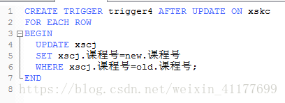 3、创建触发器trigger4,实现当修改学生课程表(xskc)中的某门课的课程号时,对应学生成绩表(xscj)中的课程号也作相应修改。