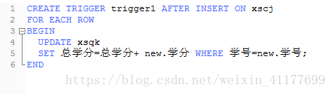1、在学生成绩库中创建触发器trigger1,实现如下功能:当在学生成绩表(xscj)中插入一条学生选课信息后,自动实现更新该学生在学生情况表(xsqk)中的总学分信息。