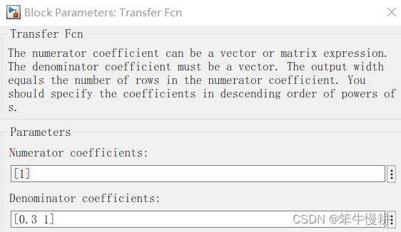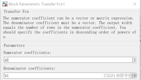 双击以上模型中第2条支路的滤波器模块,对它的传输函数的分子和分母进行参数化设置,如下所示: