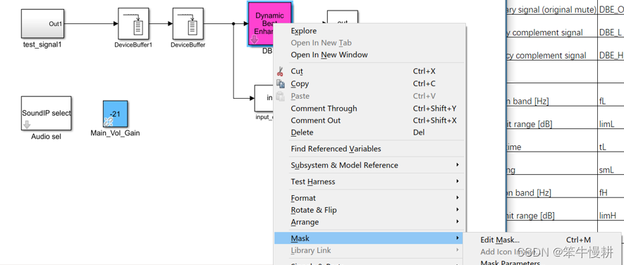 在子系统中也有类似于顶层模型那种基于回调函数的参数初始化处理方式。 右键选中子系统模块,在下拉菜单选择“Mask”,然后再选择“Edit Mask”,如下图所示: