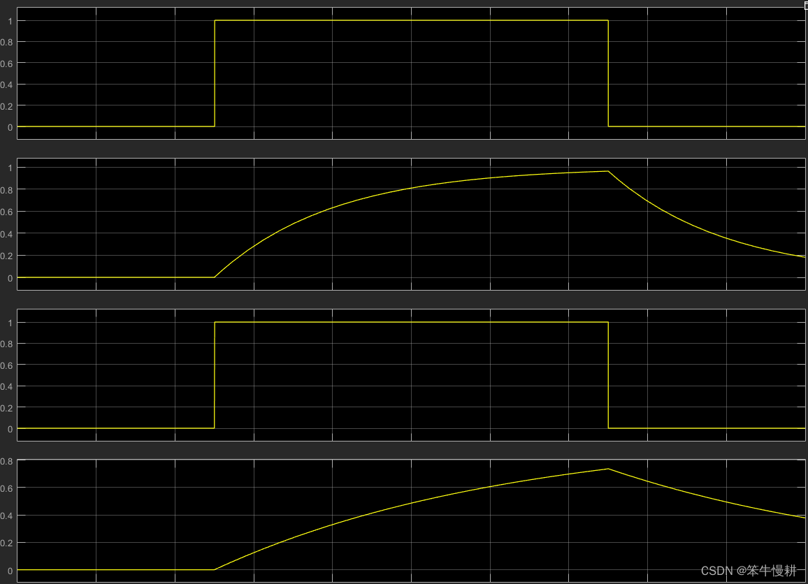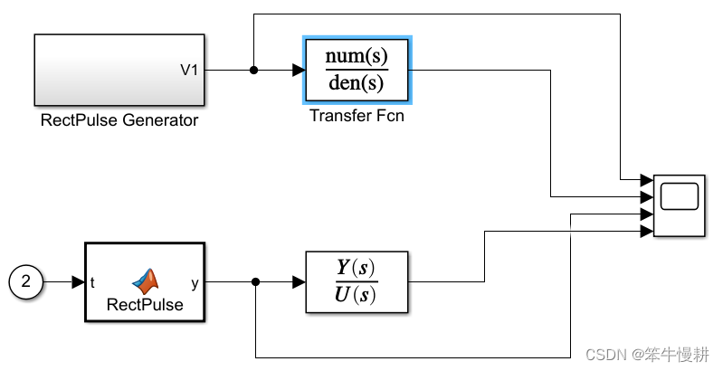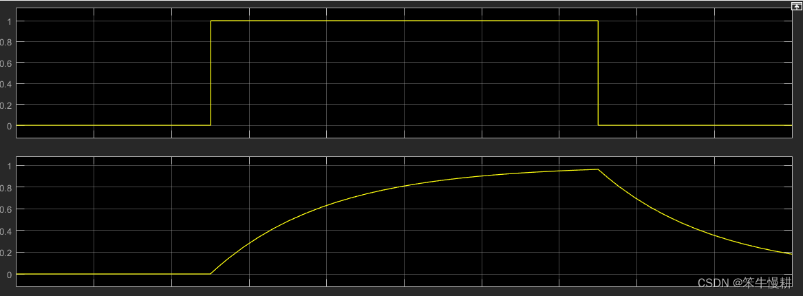 如图所示将滤波器传输函数设置为。仿真以上模型可以得到结果如下(矩形波发生器产生了一个在0.5秒从跳变到1然后又在1.5秒处从1跳变为0的矩形波。低通滤波器起到了将输入波形平滑化的作用):