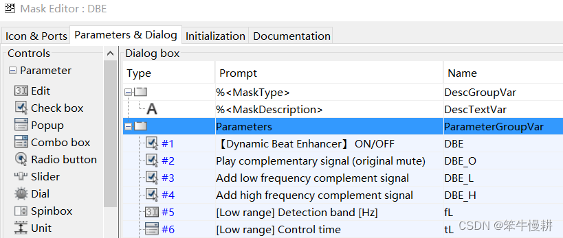 - 在Mask Editor对话框的“Parameters&Dialog”对话框中建立基本属性参数与参数变量名的对应关系