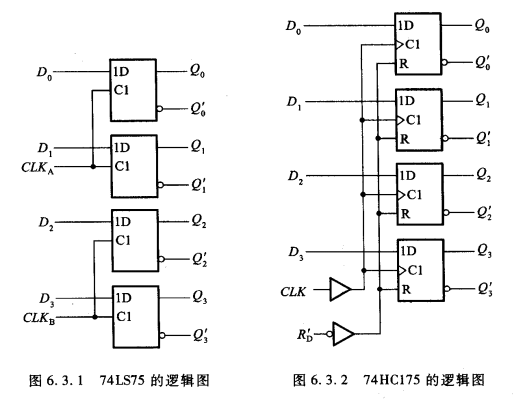 寄存器(Register)用来寄存一组二值代码,它被广泛地用于各类数字系统和计算机中。N个触发器组成的寄存器能储存N位二进制代码。如74LS75、74HC175: