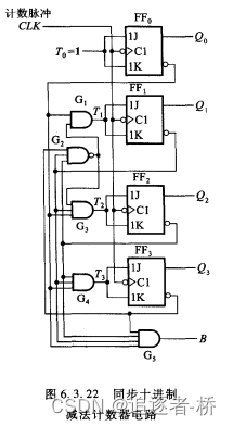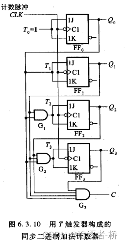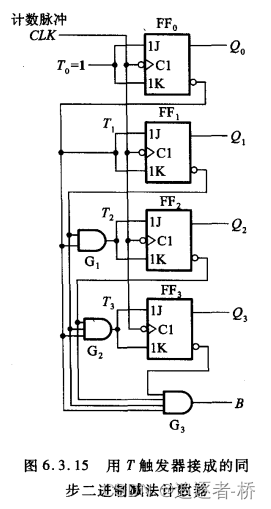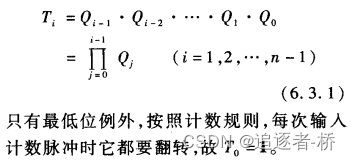 当T=1时,只要有脉冲输出就翻转,对于最低为是正常的。高一位的应何时翻转?第一位的为1时,来脉冲才进行翻转。类似的可以往后推。同时可得出逻辑式: