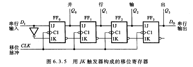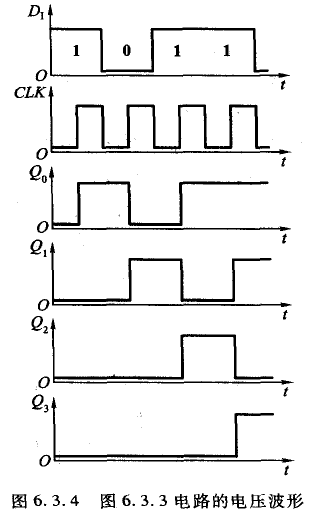 上图电路是由边沿触发的D触发器组成的4位移位寄存器。当CLK是上升沿是触发器才进行传输,例如,在4个时钟周期内(4个上升沿)输入代码依次为1011,而移位寄存器的初识状态为=0000,在移位脉冲的作用下变化如下表: