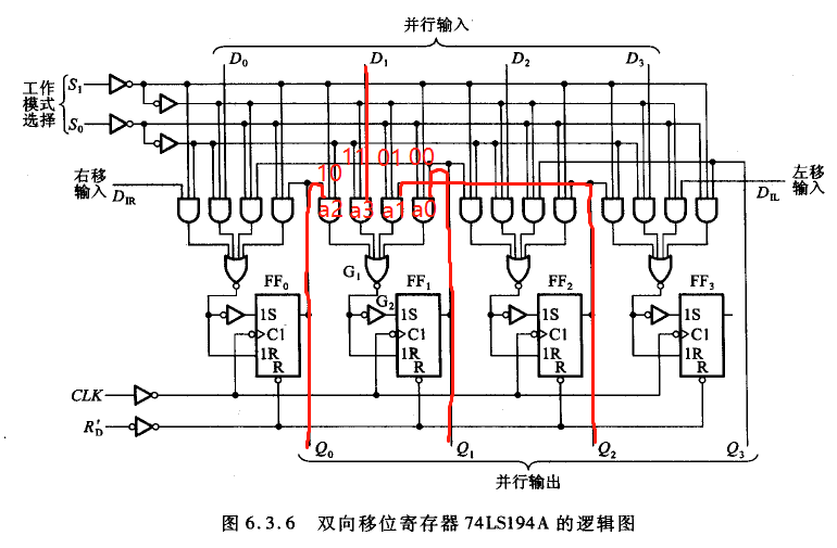 S0S1=10时,a2导通,FF1中CLK上升沿时Q1=Q0,右移功能。