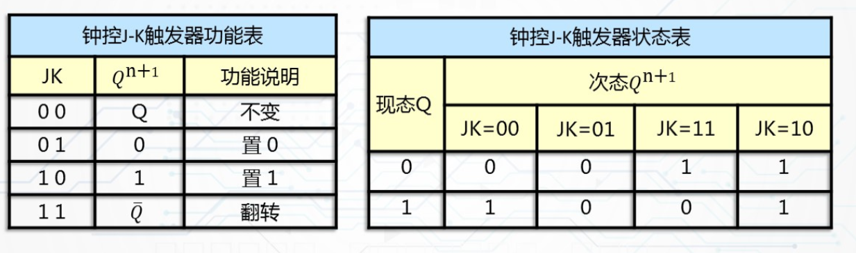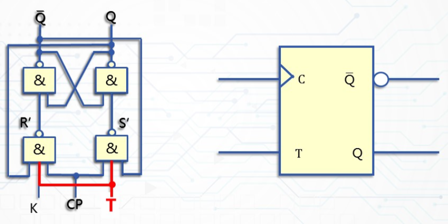 T触发器将JK两根线合并为一根,保持输入变量只有一个,功能只有不变或者翻转,相当是弱化版的JK触发器