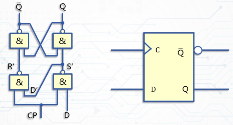 D触发器将RS触发器的R端接到S'处,保证输入端两个变量肯定互补