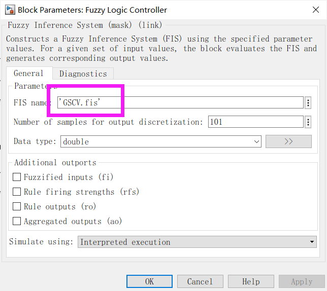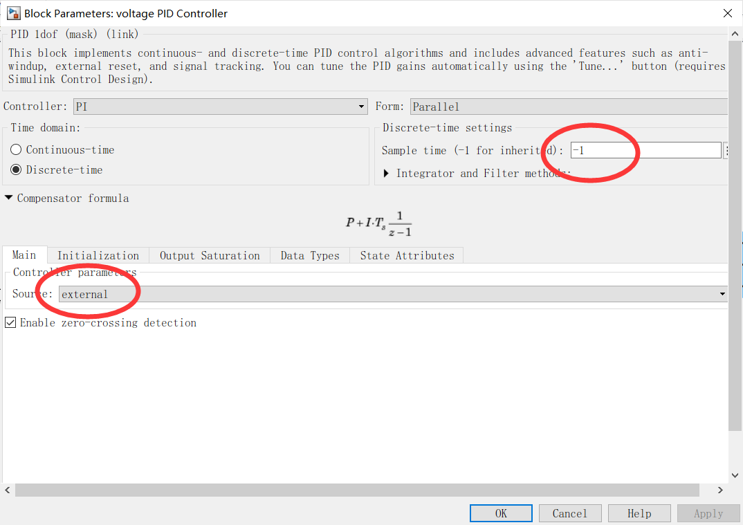 这里我用的是离散系统,所以 sample time取-1,同时我们知道,pi参数我们是通过模糊控制得出的,所以选择source为external。